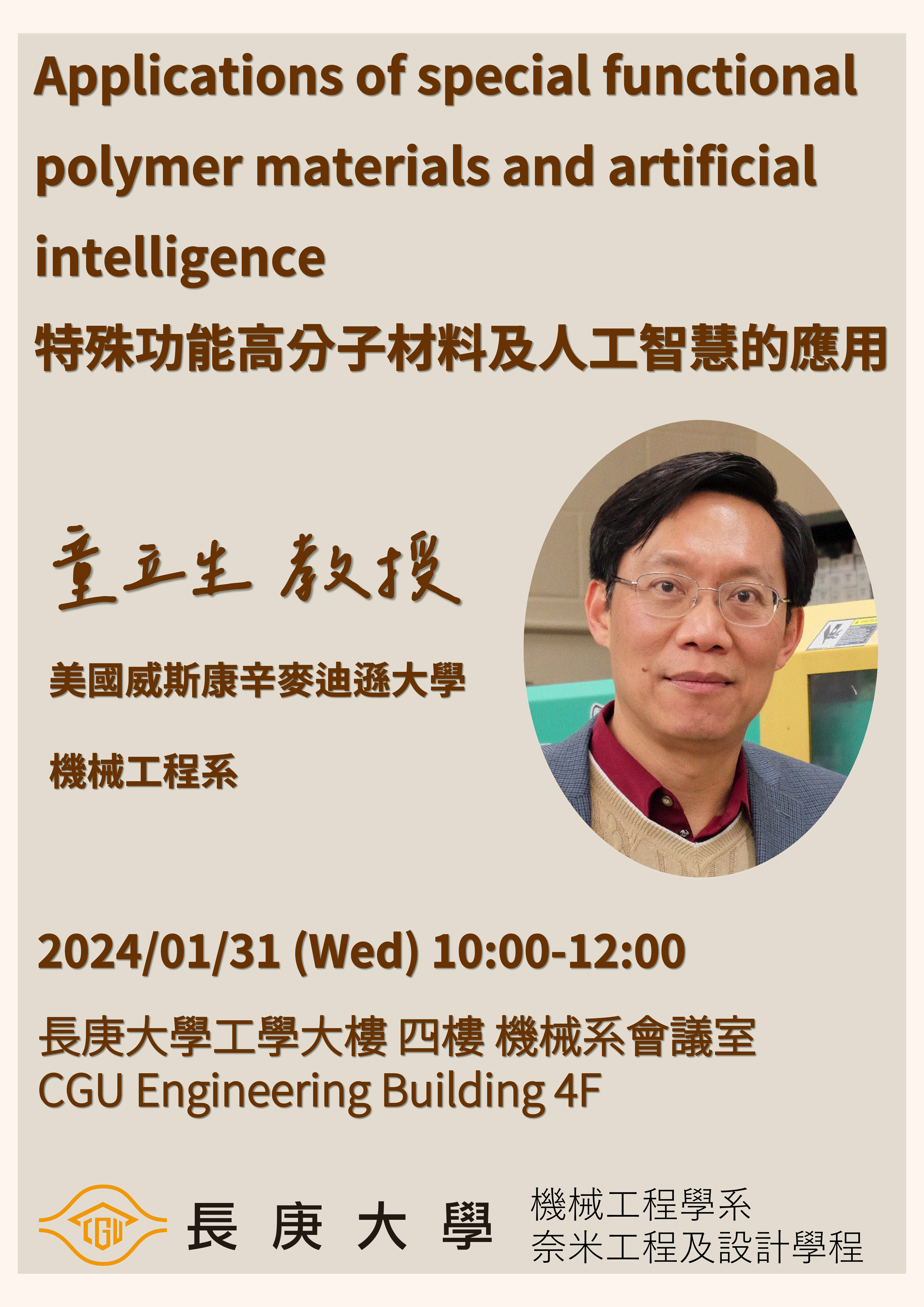 演講公告——Applications of special functional polymer materials and artificial intelligence. 童立生 教授